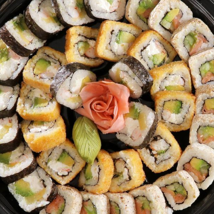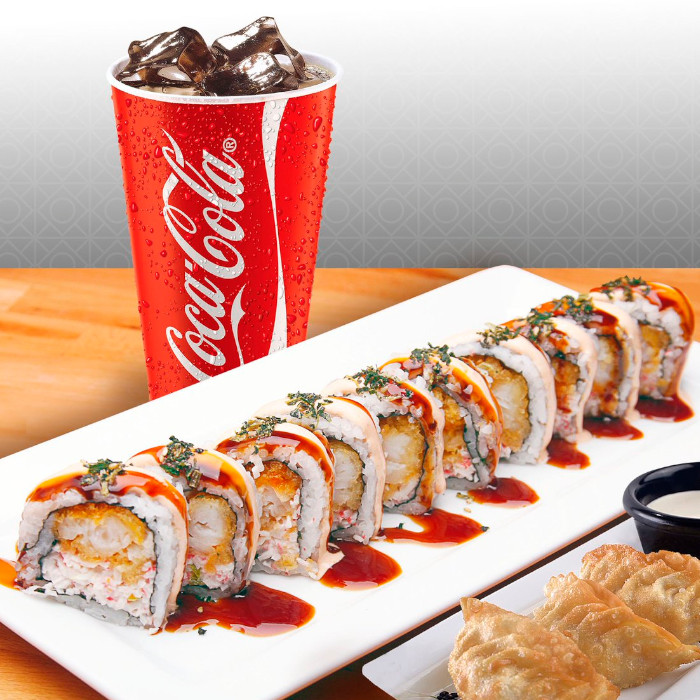 Por fuera queso y condimento de salmon, por dentro camarón anguila y salsa de anguila