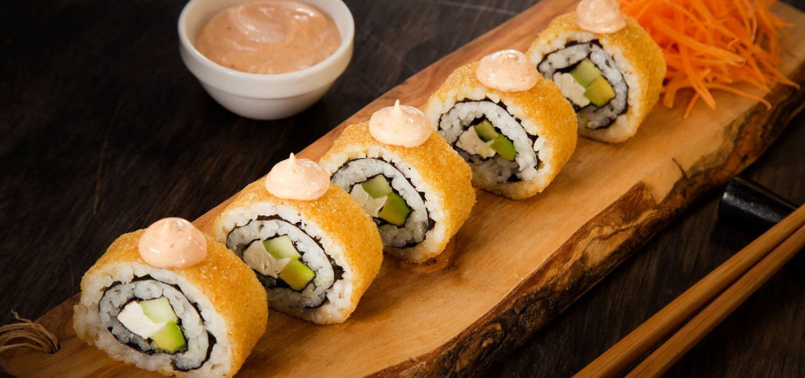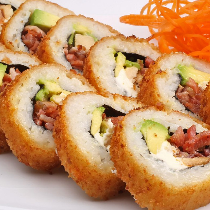 Por fuera plátano frito, por dentro camarón, queso, aguacate y salsa chipotle
